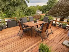 - Unterkonstruktion: Da das Deckholz sehr hart und langlebig ist, muss die Unterkonstruktion mithalten können. Wähle hierfür ebenfalls Hartholz oder besser noch Aluminium.