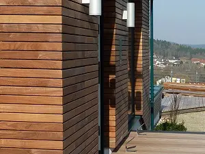 Beständige und nachhaltige Rhombusleisten aus Guyana Teak (Basralocus) mit abgerundeten Kanten robust langlebig widerstandsfähig resistent gegen Holzschädlinge und Pilzbefall Technische Raffinesse: Die Rhombusleisten aus Basralocus brillieren durch herausragende technische Eigenschaften, die sie zur optimalen Wahl für den Einsatz im Freien machen. Dank ihrer außerordentlichen Dichte und Härte überzeugen sie mit bemerkenswerter Langlebigkeit und einer hohen Beständigkeit gegenüber widrigen Witterungsbedingungen. Ganz gleich, ob es sich um Feuchtigkeit, Insekten oder Pilze handelt, Rhombusleisten aus Basralocus trotzen sämtlichen Herausforderungen und bewahren über die Jahre hinweg ihre außergewöhnliche Stabilität. Ästhetische Anziehungskraft: Die Anziehungskraft der Rhombusleisten aus Basralocus liegt in ihrer fesselnden Schönheit und exotischen Eleganz. Die Farbpalette erstreckt sich von einem warmen Mittelbraun bis hin zu einem tiefen Dunkelbraun, mit gelegentlichen rötlichen oder violetten Nuancen. Die Maserung ist oft markant und reicht von filigranen Linien bis hin zu auffälligen Wellenmustern, was dem Holz einen einzigartigen und reizvollen Charakter verleiht. Das natürliche Glänzen von Basralocus verleiht Ihrer Fassade eine luxuriöse Ausstrahlung, die Bewunderung hervorruft. Im Laufe der Zeit entwickelt das Holz eine bezaubernde silbergraue Patina, die seine natürliche Schönheit betont und Ihrer Fassade einen rustikalen, zeitlosen Charme verleiht. Anwendungsbereiche: Fassade Carportverkleidungen Sichtschutzelemente Zaun- und Balkonbau Dekorativer Bereich Wandverkleidungen (Innen und Außen) Pflege: Sie können die Rhombusleisten ölen, müssen es aber nicht. Wenn Sie regelmäßig pigmentiertes Öl verwenden, verhindern Sie das Vergrauen des Holzes. Falls nicht, bekommt es nach einiger Zeit eine schöne graue Patina. Durch das Öl werden die Fasern des Holzes gesättigt und eine Wasseraufnahme verringert, sodass das Holz weniger quellt und schwindet. Auf diese Weise beugen Sie der Rissbildung vor, welche gerade im Sommer durch die starken Temperaturschwankungen auftreten kann. Montage: Für die Befestigung von Rhombusleisten aus Guyana Teak verwenden Sie unbedingt Material aus rostfreiem Edelstahl (V2A bzw. V4A). Einfache, verzinkte Materialien reagieren mit einigen Inhaltsstoffen des Holzes. Dies kann zu unschönen Verfärbungen und dunklen Laufspuren auf dem Holz führen, die sich nicht mehr entfernen lassen. Fassadenschrauben eignen sich hervorragend für den Einsatz im Außenbereich. Wie bei allen Harthölzern empfehlen wir dringend, die Löcher für die Befestigung vorzubohren. So nehmen Sie dem Holz die Spannung, die durch die Schrauben entsteht, und vermeiden Splitter und Risse.