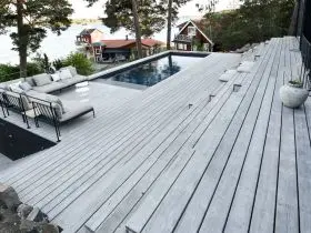 Beschreibung Die OrganoWood® Nowa Terrassendielen im Maß 45 x 145 mm sind besonders massiv und für Konstruktionen mit hoher Belastung ausgelegt – ideal für langlebige Terrassenanlagen, Stege oder andere stark frequentierte Außenbereiche. Gefertigt aus hochwertiger Kiefer aus Nordschweden und mit glatter Oberfläche auf beiden Seiten versehen, wirken die Dielen modern und zurückhaltend. Durch ein patentiertes, umweltschonendes Verfahren werden sie dauerhaft gegen Fäulnis geschützt: Ein wasserbasiertes Mineralgemisch wird tief ins Holz gepresst und verbindet sich stabil mit den Holzfasern – ganz ohne Biozide oder Schwermetalle. Vorteile Dank ihrer Stärke von 45 mm sind diese Dielen äußerst formstabil und tragfähig – ideal für tragende Unterkonstruktionen oder Bereiche mit hohen Lasten. Die glatte Oberfläche sorgt für eine angenehme Haptik und ein sauberes Erscheinungsbild. OrganoWood® Dielen sind resistent gegen Pilzbefall und Feuchtigkeit, was sie zu einer langlebigen Lösung für den Außenbereich macht. Das eingesetzte Holz stammt aus zertifizierter Forstwirtschaft und steht für nachhaltige Nutzung natürlicher Ressourcen. Die natürliche Vergrauung mit der Zeit verleiht der Terrasse einen stilvollen, silbergrauen Charakter – ganz ohne zusätzliche Behandlung. Pflege Diese Terrassendielen sind äußerst pflegeleicht. Es reicht aus, sie regelmäßig mit Wasser und einer weichen Bürste von Schmutz und Ablagerungen zu befreien. Eine Nachbehandlung mit Ölen oder Lasuren ist nicht erforderlich. Soll die ursprüngliche Holzfarbe erhalten bleiben, empfiehlt sich der Einsatz von speziell abgestimmten OrganoWood® Pflegeprodukten. Ansonsten entwickelt sich durch die Witterung eine gleichmäßige, natürliche Patina, die die technischen Eigenschaften des Holzes nicht beeinträchtigt.