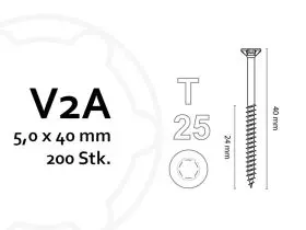 Beschreibung Die KAHRS Holzbauschrauben in der Größe 5,0 x 40 mm sind ideal für stabile Holzverbindungen im Innen- und Außenbereich. Gefertigt aus hochwertigem V2A-Edelstahl, bieten sie eine hohe Korrosionsbeständigkeit und sind besonders für feuchte Umgebungen und den Außeneinsatz geeignet. Der verstärkte Senkkopf ermöglicht ein sauberes und bündiges Versenken im Holz, während der TX25-Torx-Antrieb für eine sichere und effiziente Kraftübertragung sorgt. Die Packung enthält 200 Schrauben und eignet sich für mittelgroße bis größere Holzbauprojekte. Vorteile Für Holzverbindungen im Innen- und Außenbereich – vielseitig einsetzbar V2A-Edelstahl – rostfrei und widerstandsfähig gegen Feuchtigkeit und Witterung Verstärkter Senkkopf – für eine stabile und bündige Verschraubung TX25-Torx-Antrieb – sorgt für eine sichere und kraftvolle Verschraubung 200 Stück pro Packung – ideal für mittelgroße bis größere Holzbauprojekte