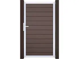 Das Besondere an den Toren der Solid-Serie ist die hochwertige Konstruktion. Die Füllung besteht aus robusten BPC-Profilen, die jedoch nicht einfach verschraubt, sondern von einem umlaufenden Aluminiumrahmen eingefasst sind. Dieser Rahmen ist silber eloxiert oder farblich passend beschichtet, was ihn absolut korrosionsbeständig macht. Er verleiht dem Tor die nötige Verwindungssteifigkeit, damit es auch bei häufiger Nutzung sauber im Schloss fällt und nicht absackt. Optisch fügt sich das Tor nahtlos in deine Zaunanlage ein, sodass keine unruhigen Stilbrüche entstehen.
